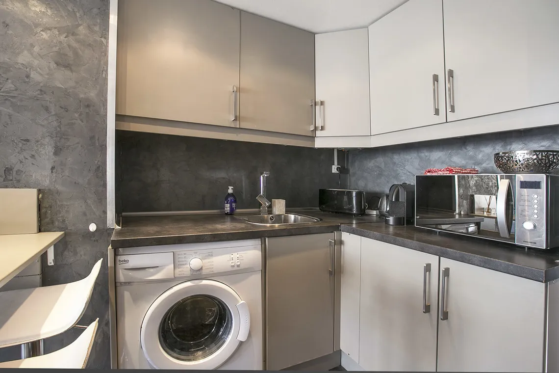 This elegant apartment blends comfort and modern urban living, designed for flexibility whether you’re working, relaxing, or socializing. The fully equipped kitchen and open living/dining space provide a welcoming atmosphere for daily life or entertaining guests. Two bathrooms add convenience and privacy.